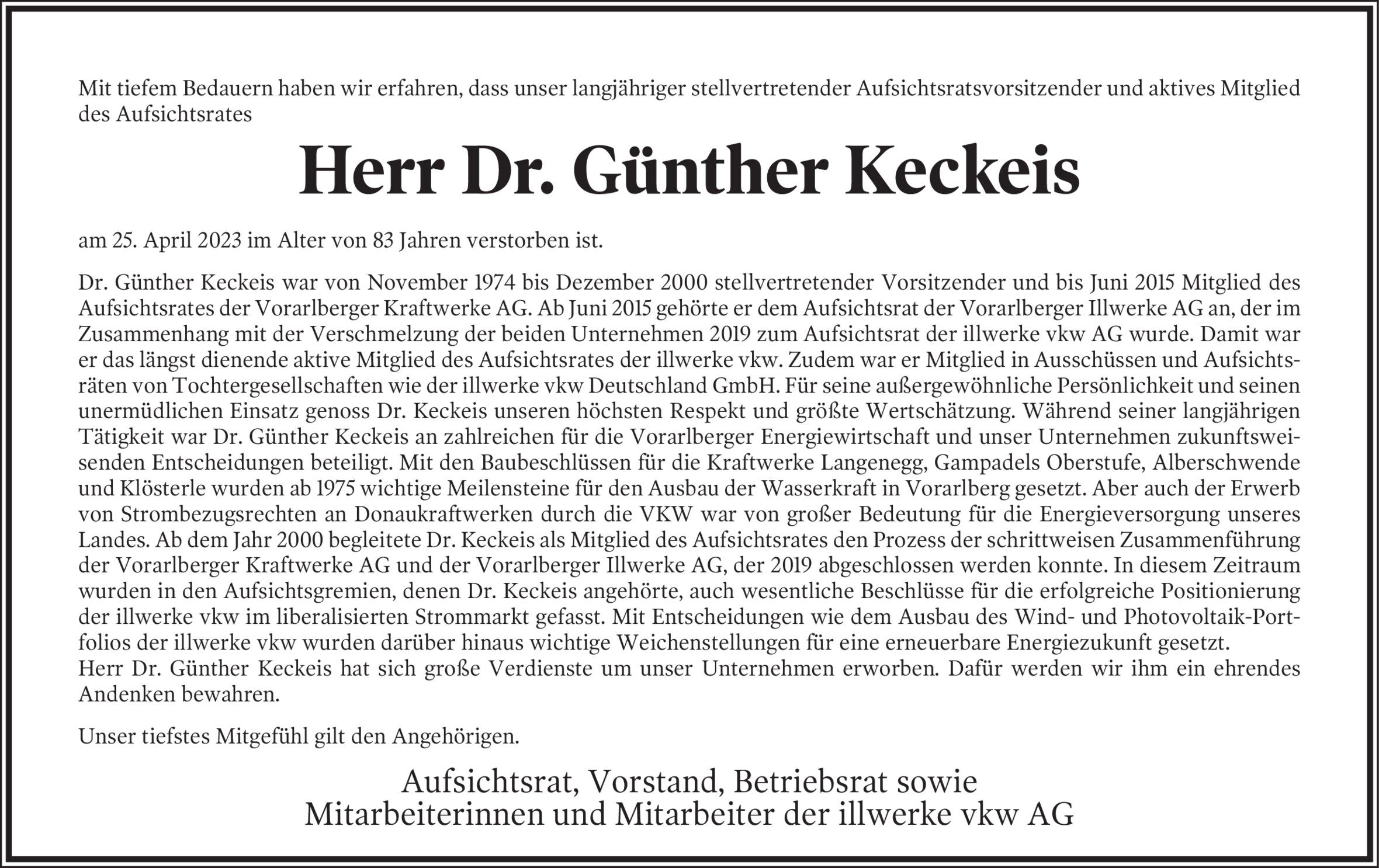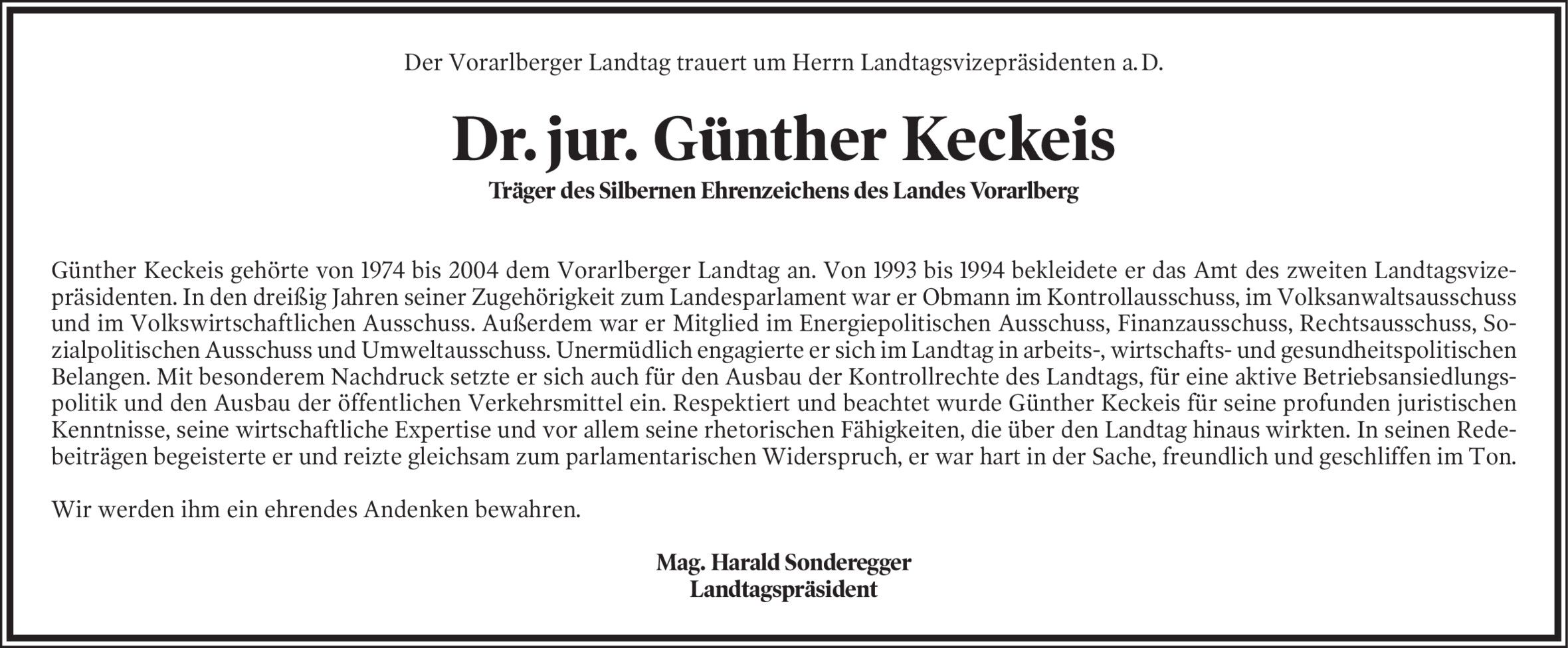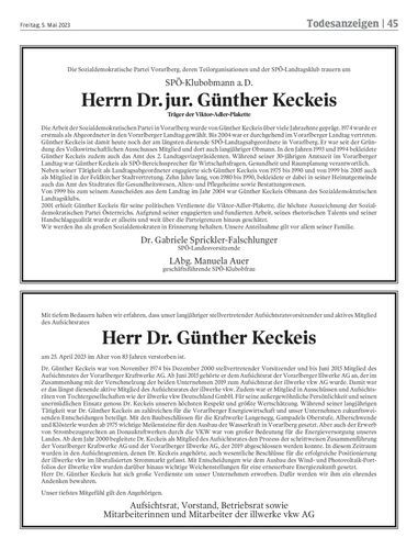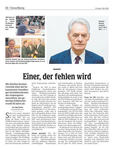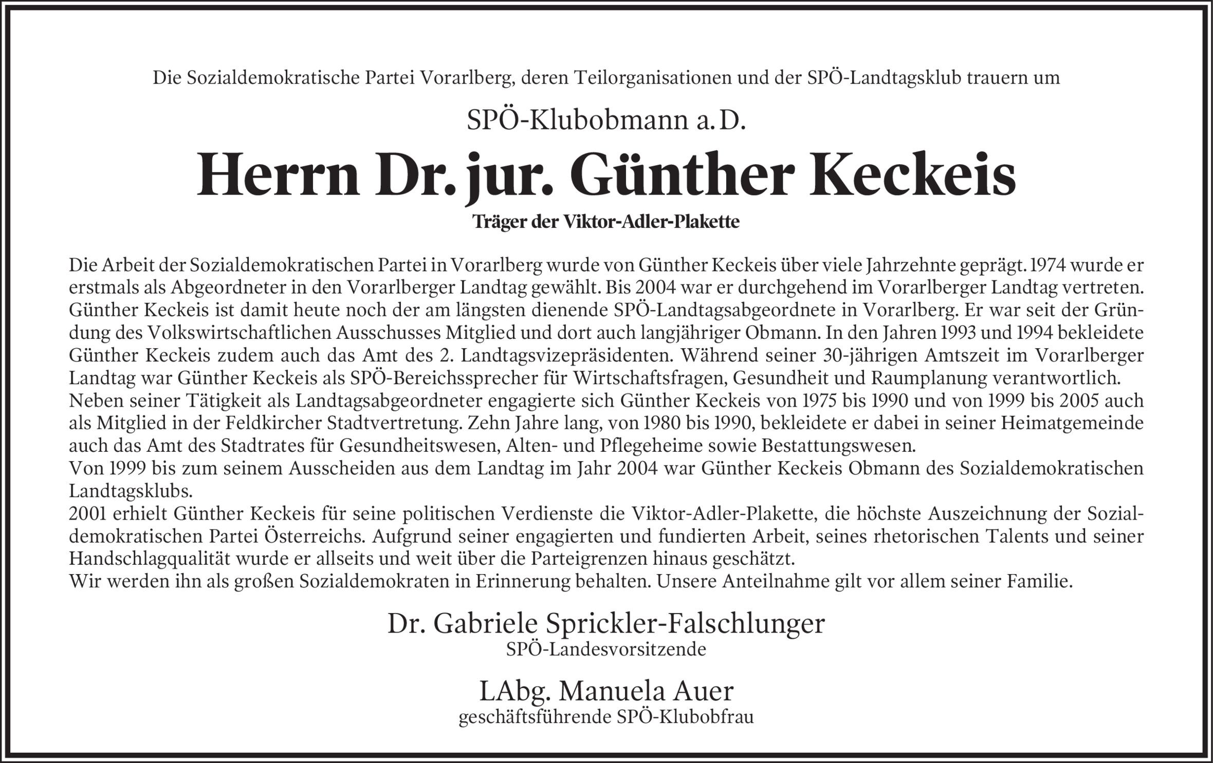 Mit Günther Keckeis verstarb einer der bekanntesten Vorarlberger Sozialdemokraten der vergangenen Jahrzehnte. Der gebürtige Feldkircher wurde 83 Jahre alt.