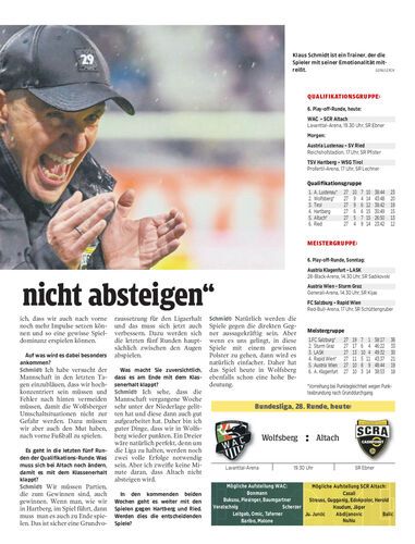 Zum Auftakt in die Rückrunde der Qualifikations-Runde trifft der SCR Altach heute um 19.30 Uhr zum zweiten Mal innerhalb einer Woche auf den Wolfsberger AC. Vor dem Abflug der Altacher machte SCRA-Coach Klaus Schmidt einen Ausblick auf die Partie.