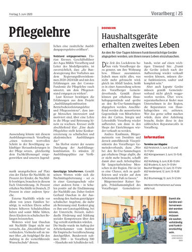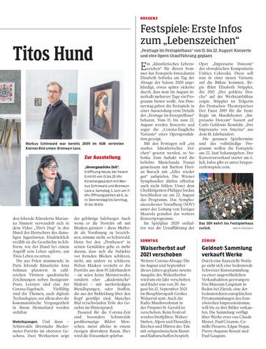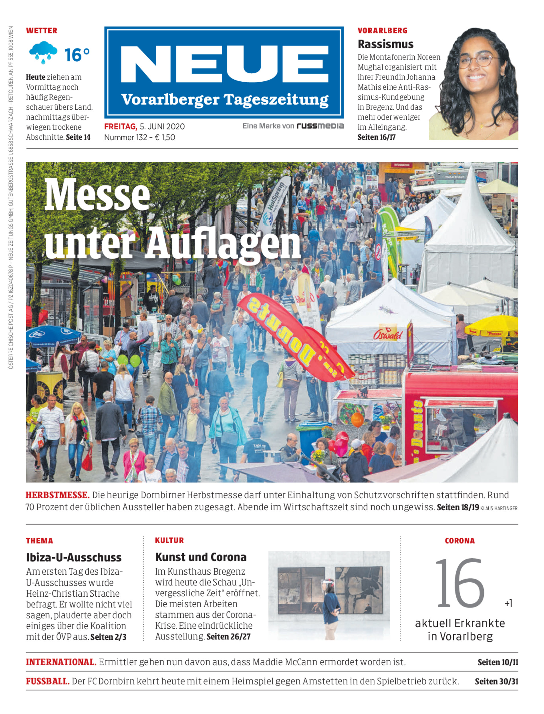 Herbstmesse. Die heurige Dornbirner Herbstmesse darf unter Einhaltung von Schutzvorschriften stattfinden. Rund 70 Prozent der üblichen Aussteller haben zugesagt. Abende im Wirtschaftszelt sind noch ungewiss. Seiten 18/19 Klaus Hartinger