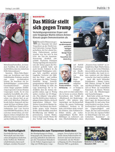 Der amtierende US-Verteidigungsminister Esper und sein Vorgänger Mattis lehnen einen Armee-Einsatz gegen die Demonstranten ab.