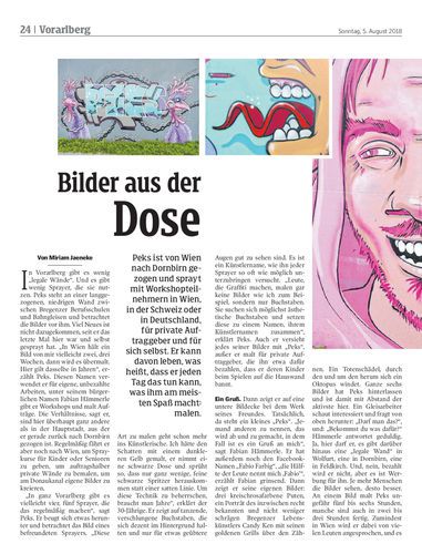 Peks ist von Wien nach Dornbirn gezogen und sprayt mit Workshopteilnehmern in Wien, in der Schweiz oder in Deutschland, für private Auftraggeber und für sich selbst. Er kann davon leben, was heißt, dass er jeden Tag das tun kann, was ihm am meisten Spaß macht: malen.