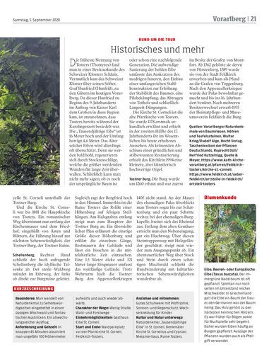 Die Geschichtenerzählerin Hertha Glück wandert zur „Tausendjährigen Eibe“ bei der Kirche zu St. Corneli. Sie geht dann zur Burg Tosters und über einen Fluchtweg zurück.
