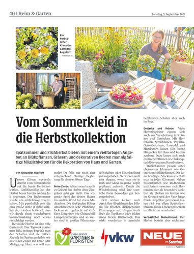 Spätsommer und Frühherbst bieten mit einem vielfarbigen Angebot an Blühpflanzen, Gräsern und dekorativen Beeren mannigfaltige Möglichkeiten für die Dekoration von Haus und Garten.