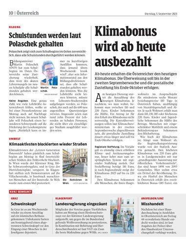 Ab heute erhalten die Österreicher den heurigen Klimabonus. Die Überweisung soll bis in der zweiten Septemberwoche und die postalische Zustellung bis Ende Oktober erfolgen.