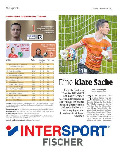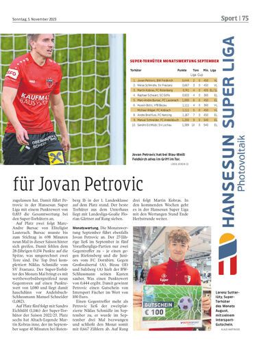 Jovan Petrovic von Blau-Weiß Feldkirch hat in der Torhüterwertung der Hansesun Super Liga die Gesamtführung übernommen. Und auch die Monatswertung September konnte er für sich entscheiden.