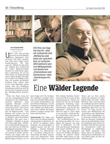Ulli Troy aus Egg hat das be-, aber oft verkannte Lied „Wäldar ka nüd jedar sin“ geschrieben, er verfasste 200 Liedtexte und war Mitbegründer von Bands wie „Stemmeisen und Zündschnur“ oder „Hanskaspas Enkel“.