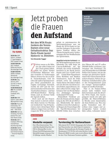 Bei den WTA Finals fordern die Tennis-Damen eine neue Gehaltsstruktur. Das Paris-Finale lautet Djokovic vs. Dimitrov. Von Alexander Tagger