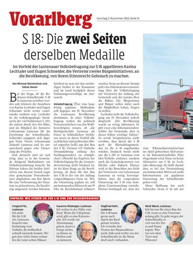 Im Vorfeld der Lustenauer Volksbefragung zur S 18 appellieren Karina Lechtaler und Eugen Schneider, die Vertreter zweier Bürgerinitiativen, an die Bevölkerung, von ihrem Stimmrecht Gebrauch zu machen.