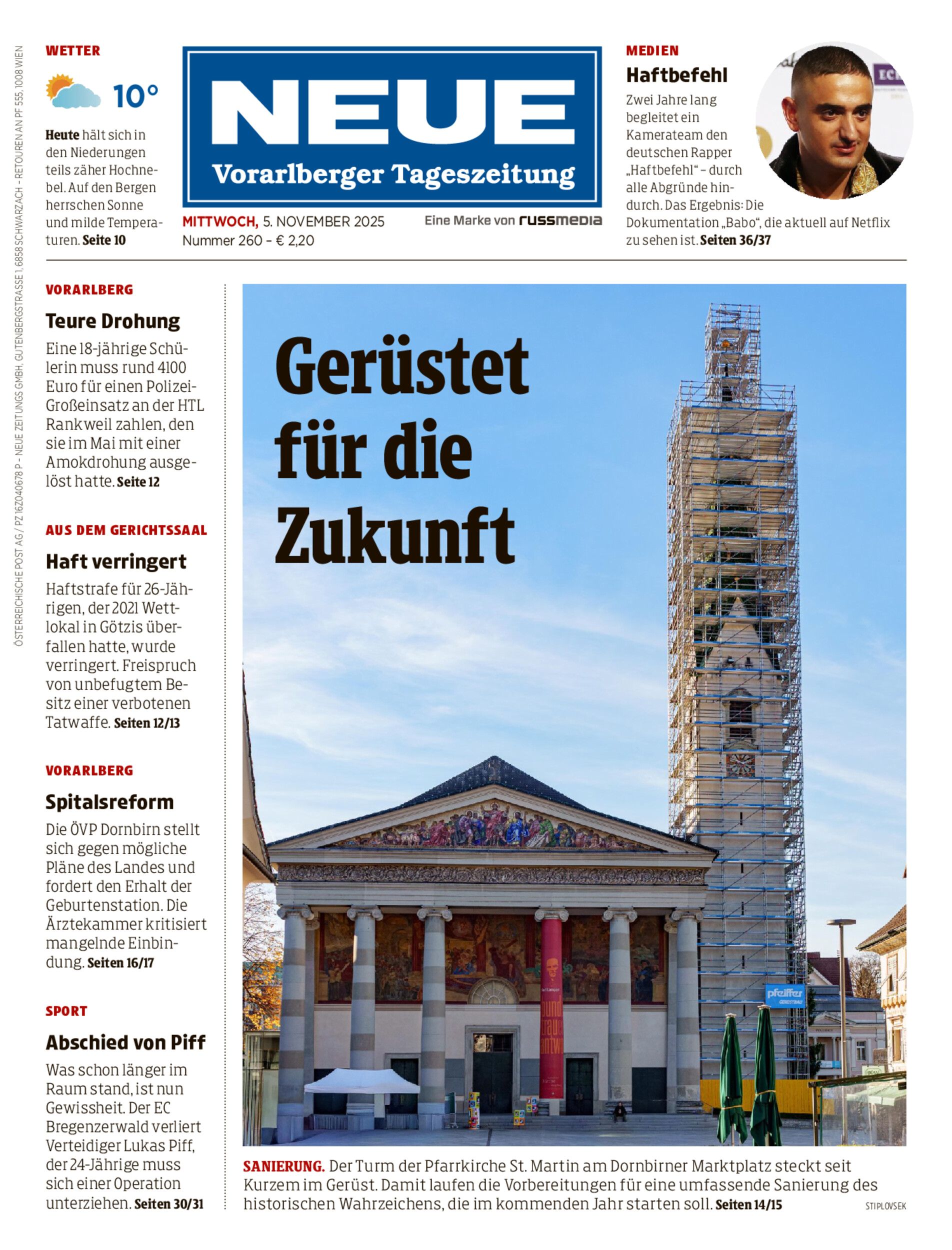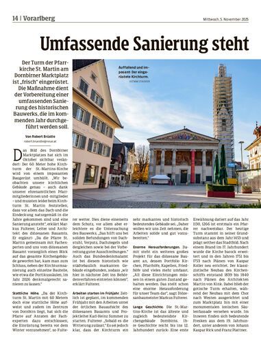 Der Turm der Pfarrkirche St. Martin am Dornbirner Marktplatz ist „frisch“ eingerüstet. Die Maßnahme dient der Vorbereitung einer umfassenden Sanierung des historischen Bauwerks, die im kommenden Jahr durchgeführt werden soll.