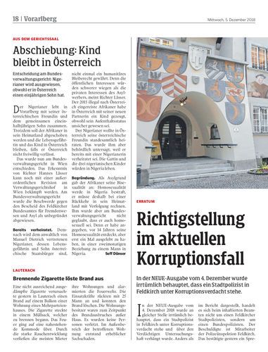 In der NEUE-Ausgabe vom 4. Dezember wurde irrtümlich behauptet, dass ein Stadtpolizist in Feldkirch unter Korruptionsverdacht stehe.