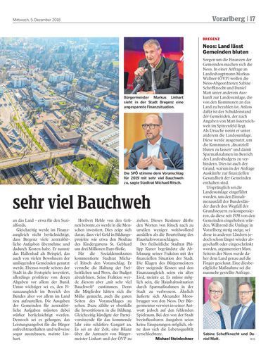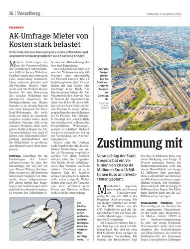 Voranschlag der Stadt Bregenz hat ein Volumen von knapp 114 Millionen Euro. 16 Millionen Euro an Investitionen geplant.