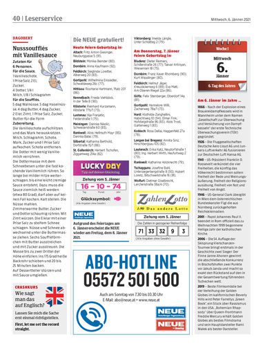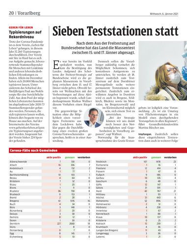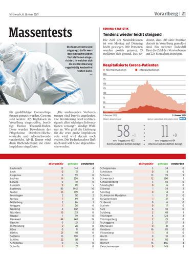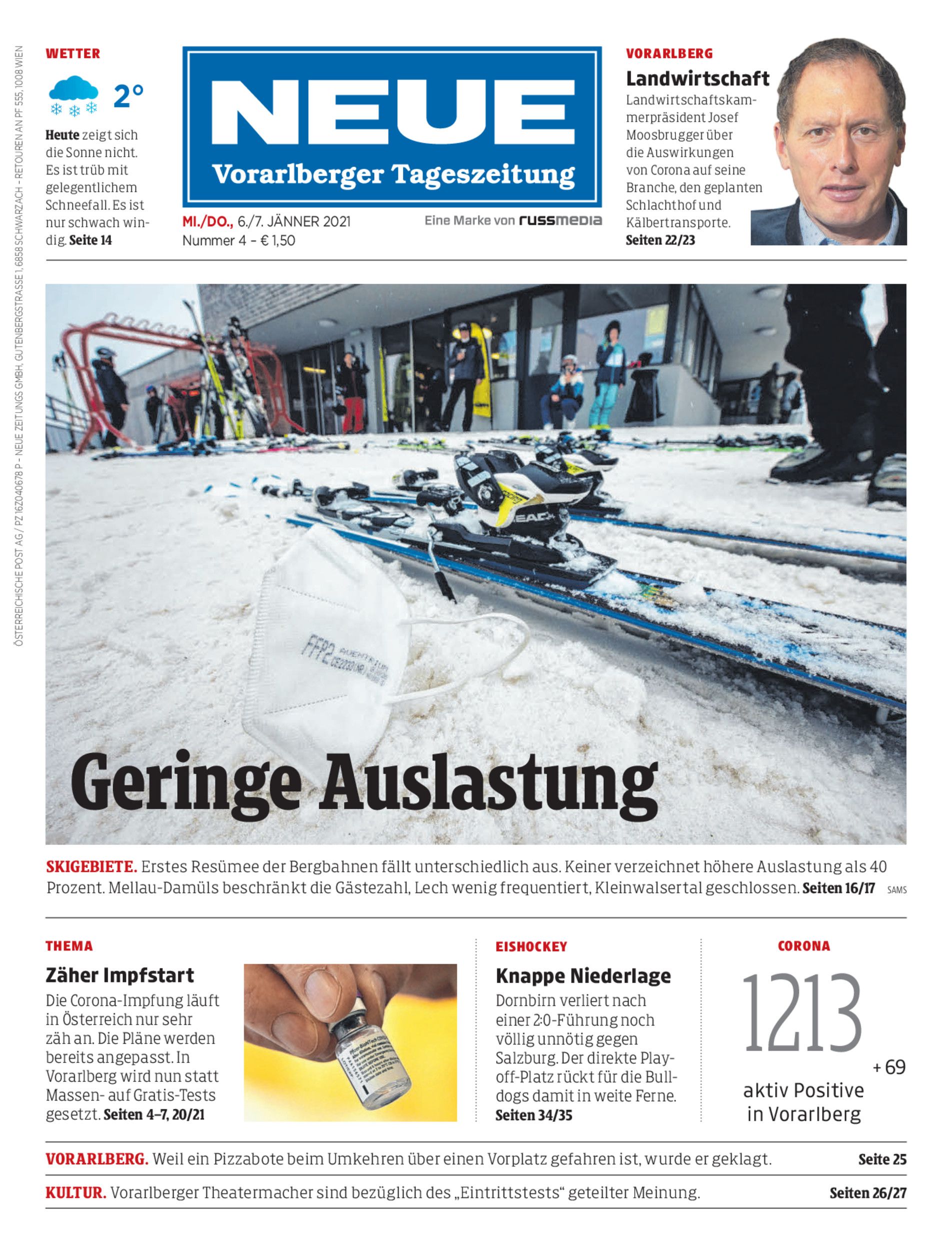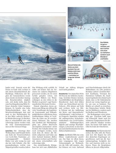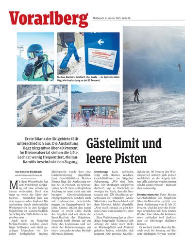Skigebiete. Erstes Resümee der Bergbahnen fällt unterschiedlich aus. Keiner verzeichnet höhere Auslastung als 40 Prozent. Mellau-Damüls beschränkt die Gästezahl, Lech wenig frequentiert, Kleinwalsertal geschlossen. Seiten 16/17 Sams