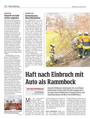 Jeweils 18 Monate Gefängnis für zwei Polen: Einbrecher fuhren 2019 mit Pkw gegen Glasfassade eines Feldkircher Fotogeschäfts und machten Beute im Wert von 92.000 Euro.
