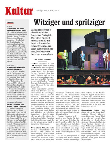 Das Landessymphonieorchester, der Bregenzer Festspielchor unter Karsten Januschke und ein internationales Solisten-Ensemble ernteten bei der Premiere von „Don Pasquale“ begeisterten Applaus.