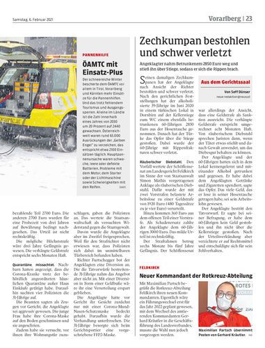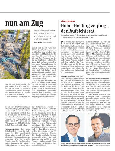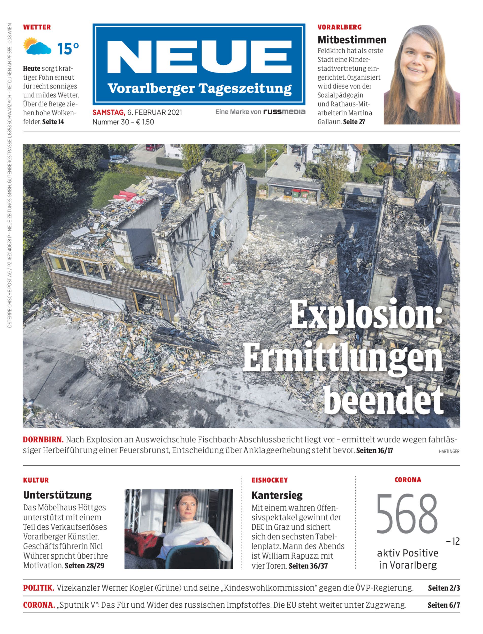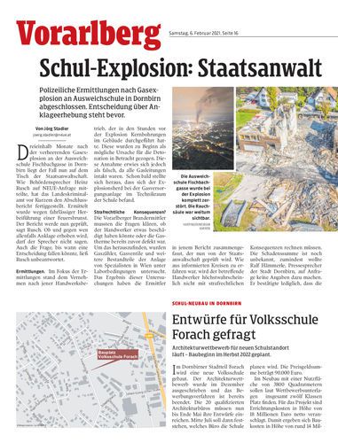 Dornbirn. Nach Explosion an Ausweichschule Fischbach: Abschlussbericht liegt vor – ermittelt wurde wegen fahrlässiger Herbeiführung einer Feuersbrunst, Entscheidung über Anklageerhebung steht bevor. Seiten 16/17 Hartinger