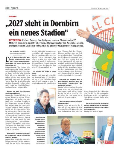 Interview. Hubert Domig, der designierte neue Obmann des FC Mohren Dornbirn, spricht über seine Motivation für die Aufgabe, seinen Fünfjahresplan und sein Verhältnis zu Trainer Muhammet Akagündüz.