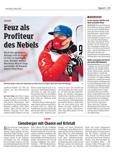 Nach der gestrigen Absage soll es heute (11 Uhr) in Saalbach eine Abfahrt geben. Matthias Mayer liegt weiterhin 48 Punkte hinter Beat Feuz.