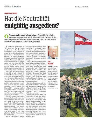 Ein neutraler oder bündnisloser Staat bleibt allein, wenn er angegriffen wird. Niemand eilt ihm zu Hilfe. Das zeigt die Ukraine. Österreich muss sich für den Nato-Beitritt oder die EU-Armee entscheiden.