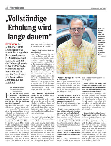 Interview. Der Autohandel steht angesichts der Corona-Krise vor großen Herausforderungen. Die NEUE sprach mit Rudi Lins, Obmann des Fahrzeughandels in der WKV, über die Stimmung bei den Händlern, die Folgen den Shutdowns und den richtigen Zeitpunkt für den Autokauf.