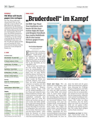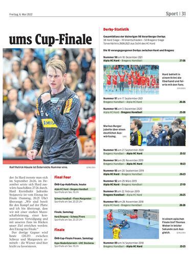 Im ÖHB-Cup-Final-Four duellieren sich heute (18 Uhr) Ausrichter Alpla HC Hard und Bregenz Handball. Das zweite Halbfinale (20.25 Uhr) lautet Schwaz gegen Fivers Margareten.