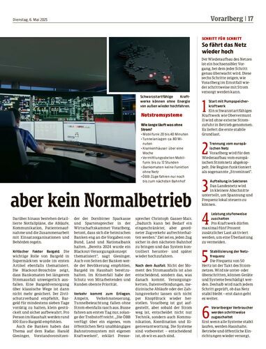 Wie in der NEUE am Sonntag berichtet, ist Vorarlberg gut auf ein Blackout-Szenario vorbereitet. Wie steht es um Banken, Verkehr und Krankenhäuser?