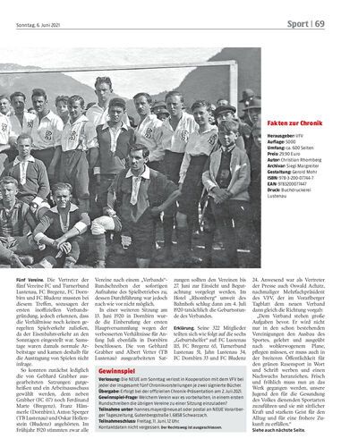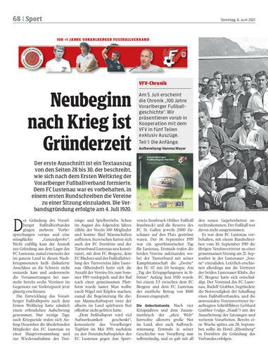 Der erste Ausschnitt ist ein Textauszug von den Seiten 28 bis 30, der beschreibt, wie sich nach dem Ersten Weltkrieg der Vorarlberger Fußballverband formierte. Dem FC Lustenau war es vorbehalten, in einem ersten Rundschreiben die Vereine zu einer Sitzung einzuladen. Die Verbandsgründung erfolgte am 4. Juli 1920.