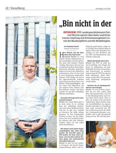 Interview. FPÖ-Landesparteiobmann Christof Bitschi spricht über Hofer und Kickl, Corona-Impfung und Krisenmanagement sowie die Maskenpflicht und die Modellregion.