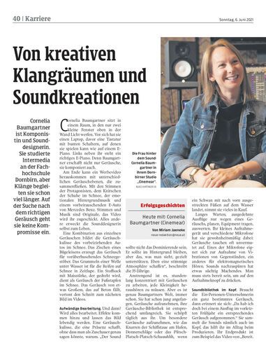 Cornelia Baumgartner ist Komponistin und Sounddesignerin. Sie studierte Intermedia an der Fachhochschule Dornbirn, aber Klänge begleiten sie schon viel länger. Auf der Suche nach dem richtigen Geräusch geht sie keine Kompromisse ein.
