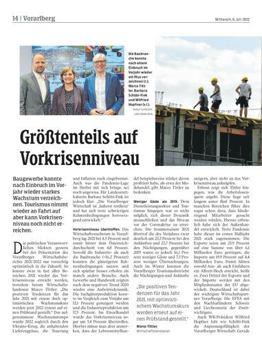 Baugewerbe konnte nach Einbruch im Vorjahr wieder starkes Wachstum verzeichnen. Tourismus nimmt wieder an Fahrt auf aber kann Vorkrisenniveau noch nicht erreichen.