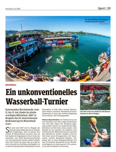 Kommendes Wochenende, vom 12. bis 13. Juli, findet im altehrwürdigen Militärbad „Mili“ in Bregenz der 24. internationale Bodenseecup im Wasserball statt.