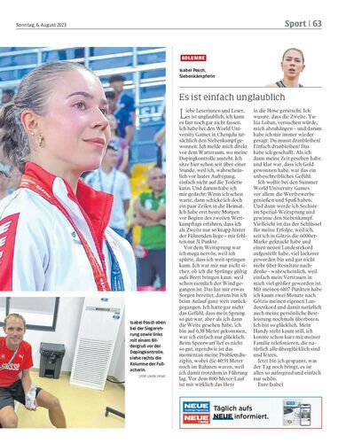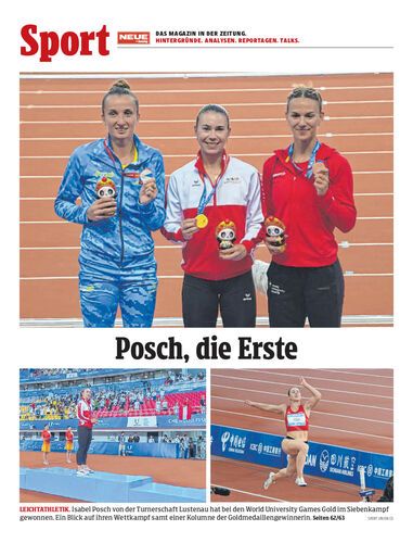 Die Fußacherin Isabel Posch hat bei den World University Games in Chengdu (China) mit einem neuen Landesrekord den Siebenkampf gewonnen, nachdem sie nach dem ersten Tag auf dem zweiten Platz lag. Die Hörbranzerin Chiara-Belinda Schuler wurde Sechste.