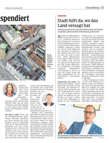 Hohenems stellt sicher, dass den Pflichtschulen 15 Stunden zusätzliche administrative Unterstützung zukommen.