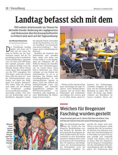 ÖVP wählte Arbeitsmarkt als Thema für Aktuelle Stunde. Änderung des Jagdgesetzes und Diskussion über Rechnungshofbericht zu Fußach sind auch auf der Tagesordnung.