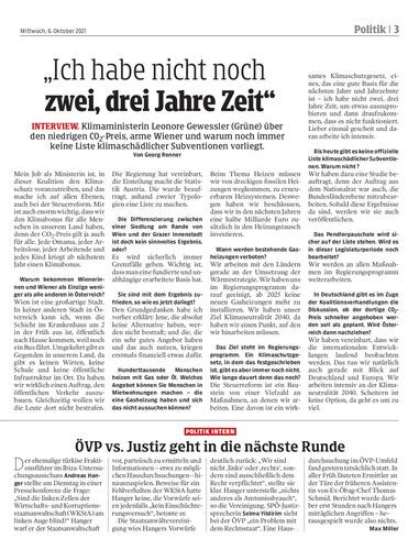 Klimaministerin Leonore Gewessler (Grüne) über den niedrigen CO2-Preis, arme Wiener und warum noch immer keine Liste klimaschädlicher Subventionen vorliegt. Von Georg Renner