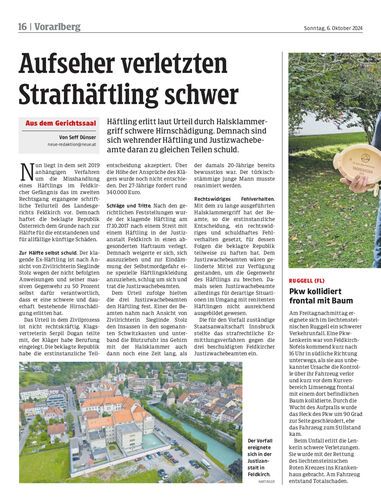 Häftling erlitt laut Urteil durch Halsklammergriff schwere Hirnschädigung. Demnach sind sich wehrender Häftling und Justizwachebeamte daran zu gleichen Teilen schuld.