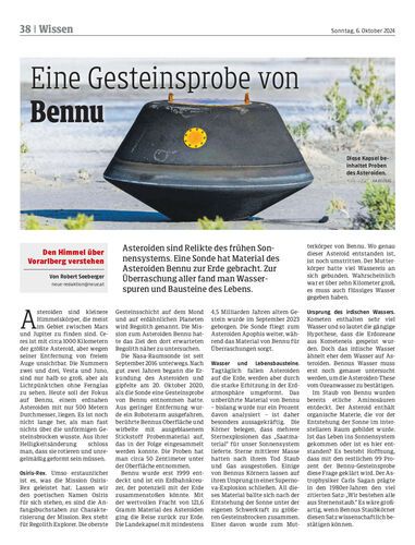 Asteroiden sind Relikte des frühen Sonnensystems. Eine Sonde hat Material des Asteroiden Bennu zur Erde gebracht. Zur Überraschung aller fand man Wasserspuren und Bausteine des Lebens.