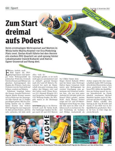 Beim erstmaligen Weltcupstart auf Matten in Wisla holte Marita Kramer vor Eva Pinkelnig Platz zwei. Stefan Kraft führte bei den Herren ein starkes ÖSV-Quartett an und sprang hinter Lokalmatador Dawid Kubacki und Halvor Egner Granerud auf Rang drei.
