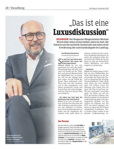 Interview. Der Bregenzer Bürgermeister Michael Ritsch über seine ersten beiden Jahre im Amt, die Debatte um die autofreie Innenstadt und seine erste Erwähnung der Leerstandsabgabe im Landtag.