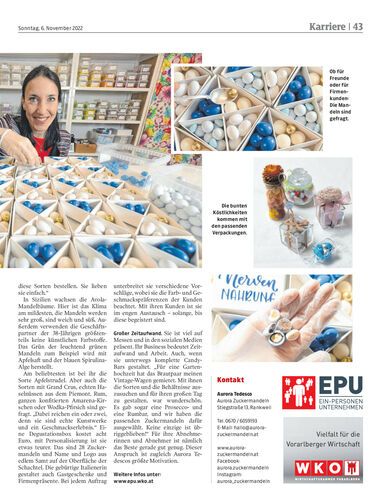 Aurora Tedesco wohnt mit ihrem Mann und ihren zwei Kindern in Rankweil. In einem Staunen machenden Showroom im Souterrain bietet sie ihre hochwertigen italienischen Zuckermandeln feil. Als Gastgeschenk, Firmenpräsent oder einfach für den besonderen Genuss zu Hause – die Möglichkeiten sind so vielfältig wie die Sorten.