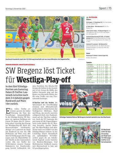 In den fünf Eliteliga-Partien am Samstag fielen 25 Treffer. Lauterach rutschte nach dem 3:4 daheim gegen Rankweil auf Platz vier zurück.