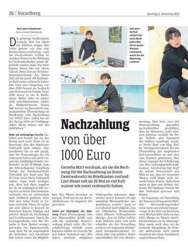 Cornelia Matt erschrak, als sie die Rechnung für die Nachzahlung an ihrem Zweitwohnsitz im Briefkasten vorfand. Laut dieser soll sie 26 Mal so viel Kaltwasser wie sonst verbraucht haben.