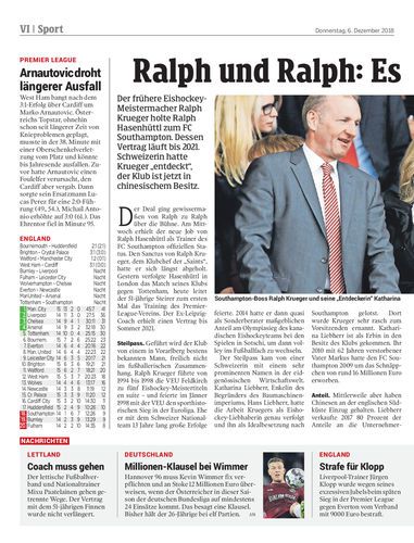 Der frühere Eishockey-Meistermacher Ralph Krueger holte Ralph Hasenhüttl zum FC Southampton. Dessen Vertrag läuft bis 2021. Schweizerin hatte Krueger „entdeckt“, der Klub ist jetzt in chinesischem Besitz.