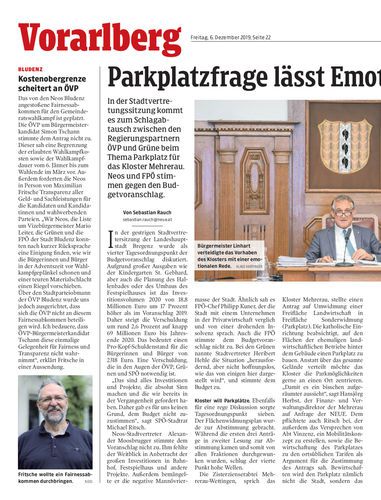 In der Stadtvertretungssitzung kommt es zum Schlagabtausch zwischen den Regierungspartnern ÖVP und Grüne beim Thema Parkplatz für das Kloster Mehrerau. Neos und FPÖ stimmen gegen den Budgetvoranschlag.