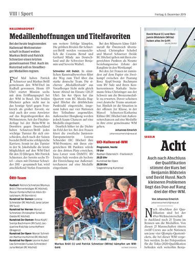 Bei der heute beginnenden Hallenrad-Weltmeisterschaft in Basel wollen Markus Bröll und Patrick Schnetzer einen letzten gemeinsamen Titel. Auch im Kunstrad soll es Vorarlberger Medaillen regnen.