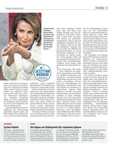 Amtsenthebung. Für Donald Trump wird es ernst: Die Präsidentin des Repräsentantenhauses beauftragt Kongress-Ausschuss, ein Amtsenthebungsverfahren gegen den US-Präsidenten einzuleiten. Seiten 4/5 AFP/Nicholas Kamm