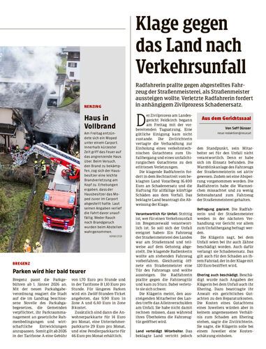 Radfahrerin prallte gegen abgestelltes Fahrzeug der Straßenmeisterei, als Straßenmeister aussteigen wollte. Verletzte Radfahrerin fordert in anhängigem Zivilprozess Schadenersatz.