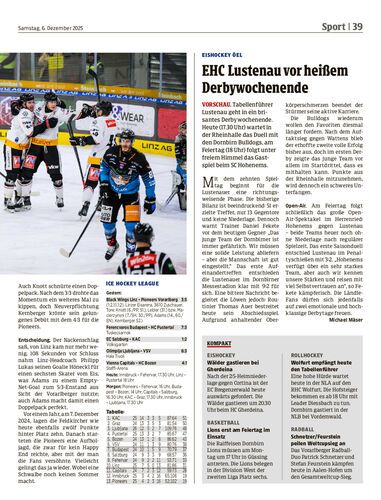 Vorschau. Tabellenführer Lustenau geht in ein brisantes Derbywochenende. Heute (17.30 Uhr) wartet in der Rheinhalle das Duell mit den Dornbirn Bulldogs, am Feiertag (18 Uhr) folgt unter freiem Himmel das Gastspiel beim SC Hohenems.