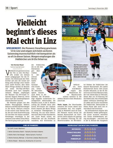 Spielbericht. Die Pioneers Vorarlberg gewinnen 5:3 in Linz und zeigen sich beim sechsten Saisonsieg mannschaftlich viel kompakter als so oft in dieser Saison. Morgen empfangen die Feldkircher um 16 Uhr Fehervar.