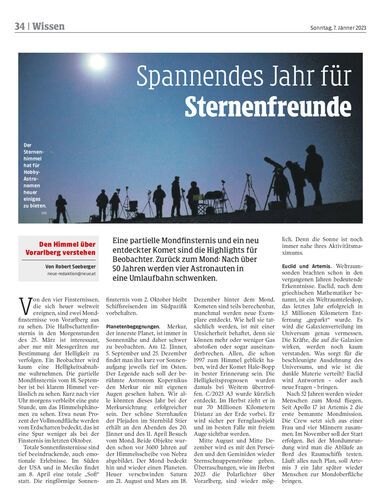 Eine partielle Mondfinsternis und ein neu entdeckter Komet sind die Highlights für Beobachter. Zurück zum Mond: Nach über 50 Jahren werden vier Astronauten in eine Umlaufbahn schwenken.