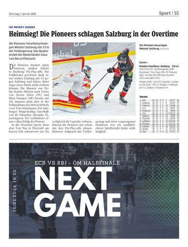 Die Pioneers Vorarlberg besiegen Meister Salzburg mit 3:2 in der Verlängerung. Das Siegtor erzielt der Niederländer Guus van Nes in Überzahl.